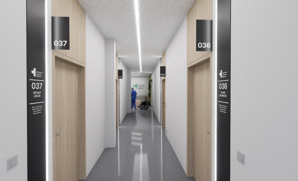 Jedná se o prostory v druhém patře nadzemního podlaží o celkové výměře 740 m2. Jednotlivé ordinace, lze nyní (ve fázi stavby) prostorově modifikovat dle přání a potřeb. Sociální zařízení je uzpůsobené pro invalidy. Dva bezbariérové vstupy s výtahy. Veškeré prostory s klimatizací a rekuperací vzduchu. Venkovní terasy pro odpočinek. Za hezkého počasí mohou terasy může sloužit jako čekárna.